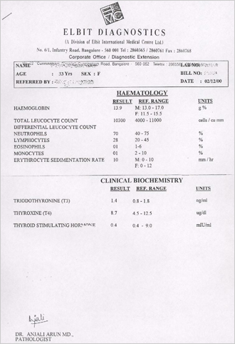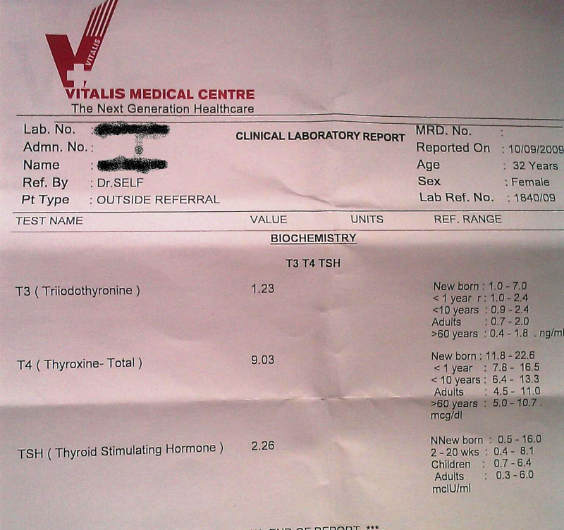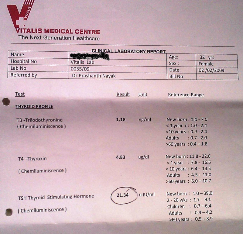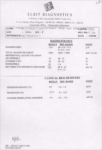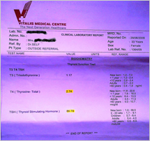 This is a case of Mrs YYY.she was declared as a thyroid patient and suffering from weakness, loss of weight etc. She approached us with lot of suspicion. the following test report shows her condition before our treatment |